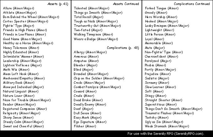Choosing your traits is the first step in making your character who he or she is. These are those things that make you unique and fit into your backstory. Being the Big Damn Hero that you are, you have 54 points to distribute to your Traits and Attributes. Traits are broken down into Assets (good stuff) and Complications (makes life interestin’). You have to choose at least 1 Asset and at least 1 Complication and you can have no more than 5 of each. Assets take away from your points and Complications add back points. A Minor trait is worth 2 points and a Major is worth 4.